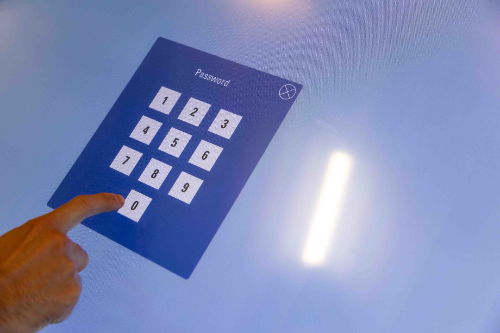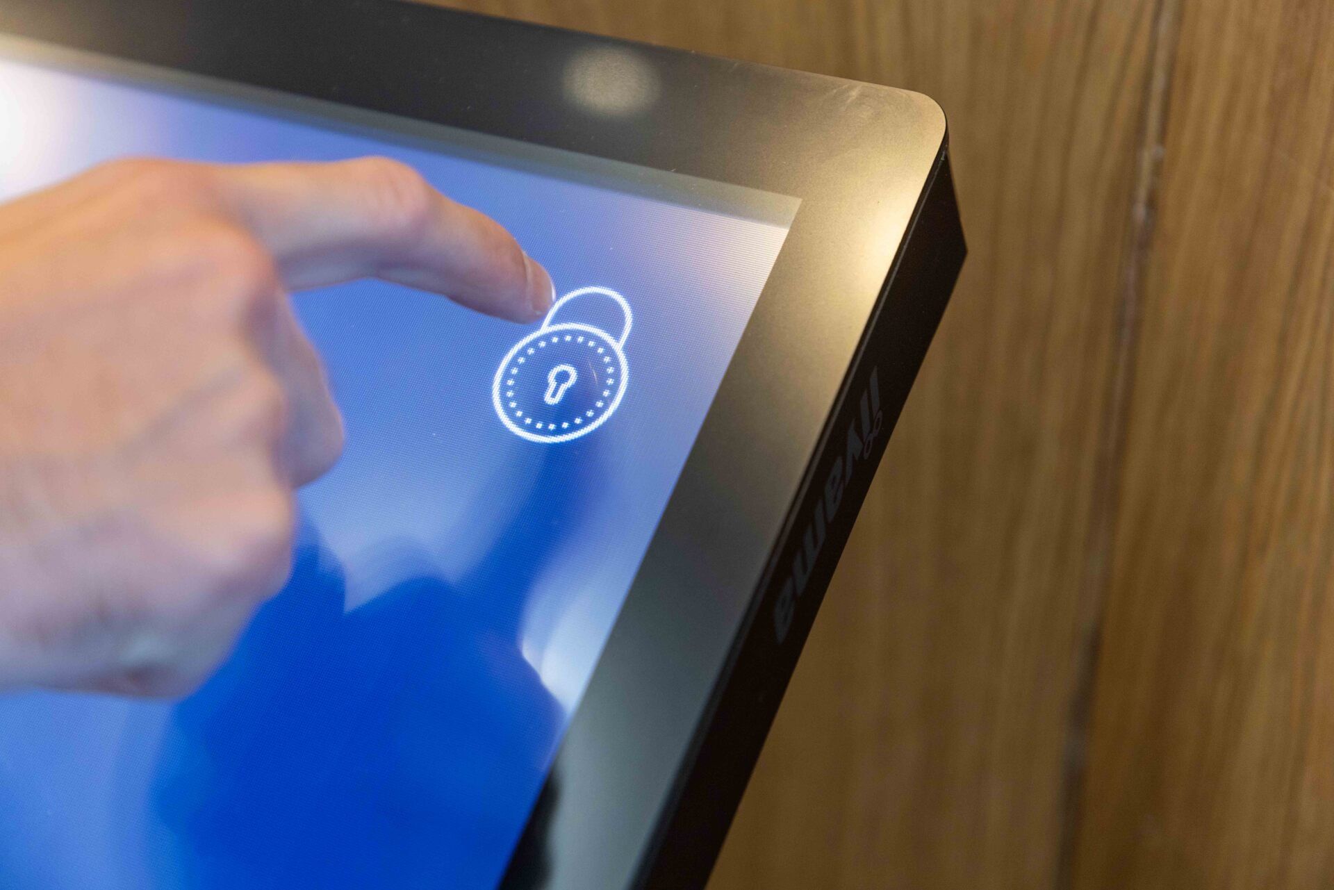 Touchskærmen gør det muligt for besøgende at klikke gennem Terma´s mange brochure. Her er der også mulighed for at de besøgende nemt og hurtigt kan få tilsendt de ønskede brochure på mail ved blot at klikke dem til og skrive sin mail-adresse.